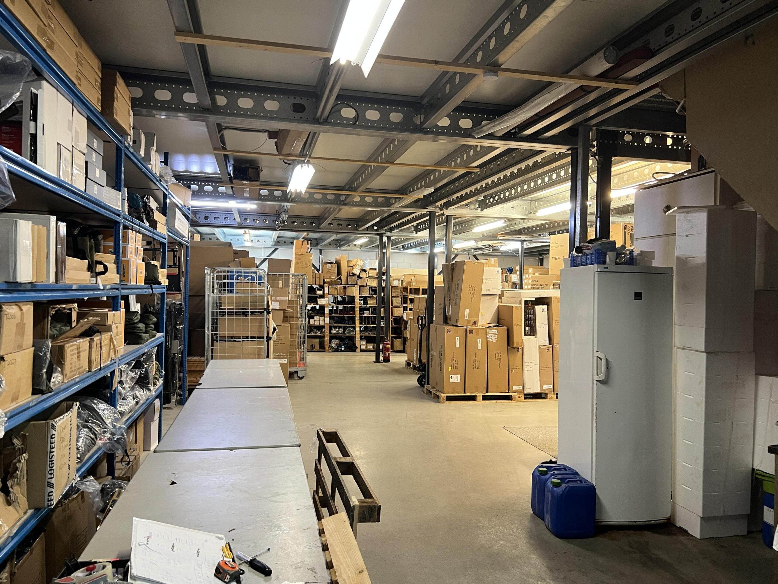 - Mezzanine/entresolvloeren: ca. 40 m² betonnen entresolvloer boven het kantoorgedeelte + ca. 195 m² systeemvloer (via stalen trap).